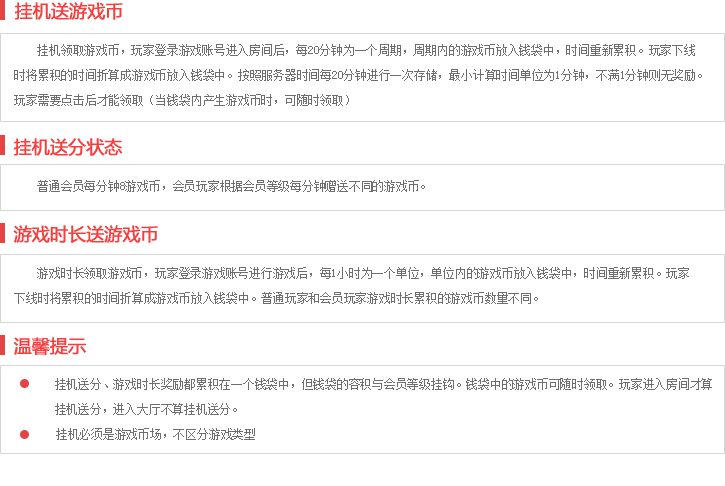 | 会员等级 | 钱袋游戏币容积 | 挂机奖励 | 游戏时常奖励 | 纯挂机堆满时间 |